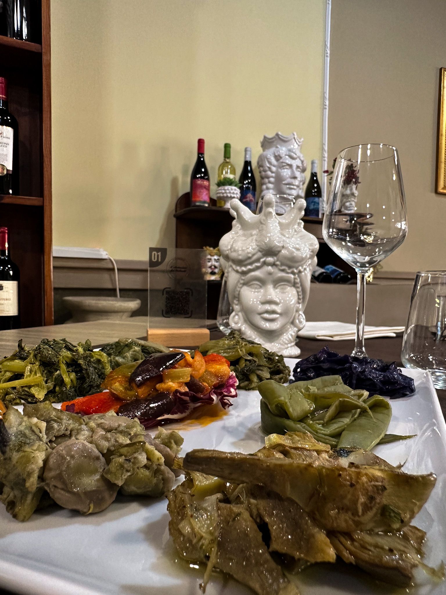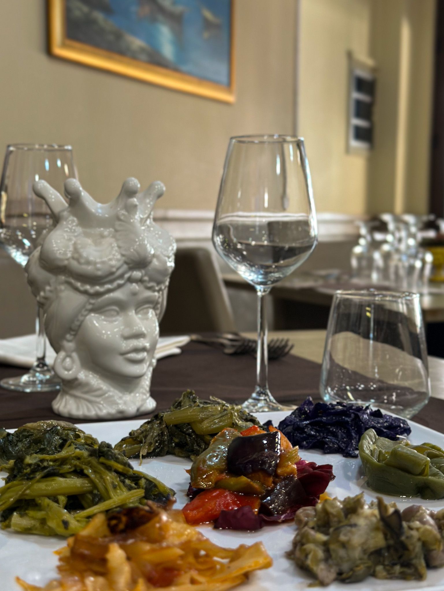 Il nostro antipasto misto è composto da sole verdure fresche di stagione a km 0, selezionate con cura dai terreni delle dolci colline Nebroidee e della costa Tirrenica.